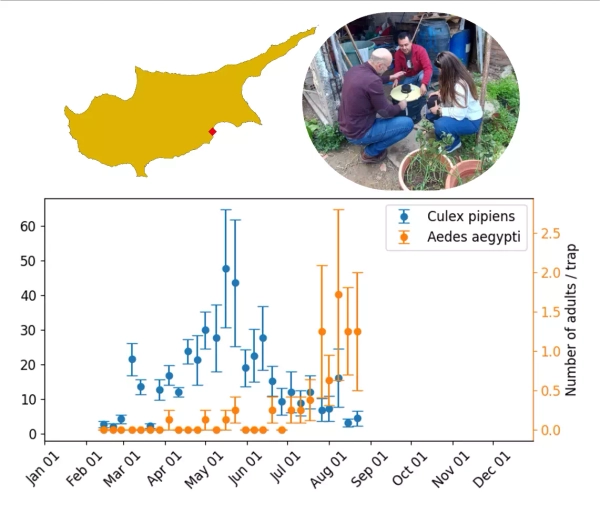 To better understand the seasonal dynamics of Aedes aegypti in Cyprus, The Cyprus Institute is conducting an adult mosquito monitoring study in Larnaca, where the species is currently established. The study is carried out in collaboration with the Ministry of Health and supported by the EMME-CARE and Mosquitoes Without Borders projects. Each week, adult mosquitoes are collected from a small urban area using eight BG-Sentinel traps baited with BG-Lure and dry ice. Below, we present the initial results ahead of the Workshop to contribute to a better understanding of seasonal vector dynamics.